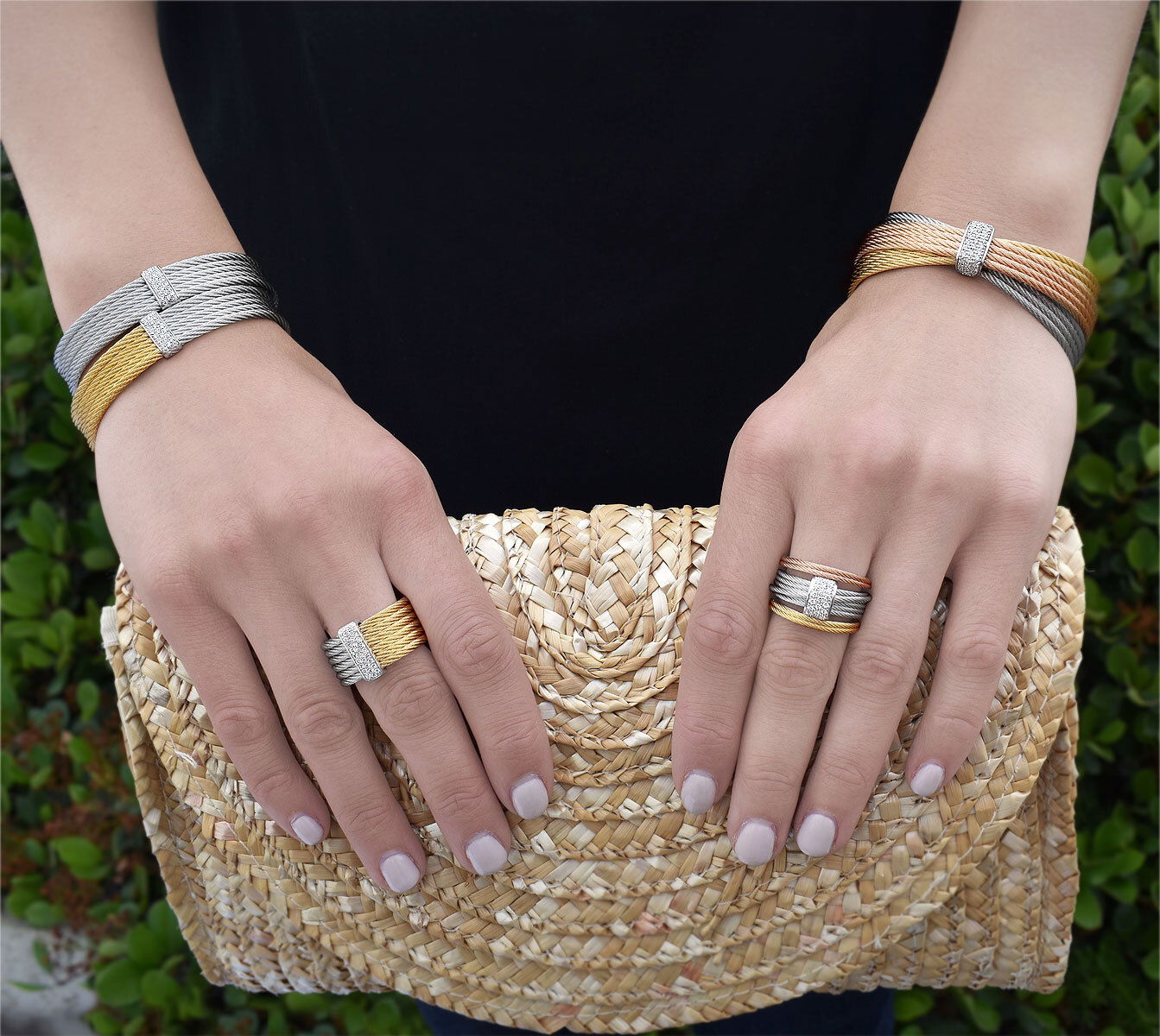 Blueberry cable and carnation cable, 18 karat Rose Gold, 0.19 total carat weight Diamonds with stainless steel. Imported. SKU: 04-48-S651-11