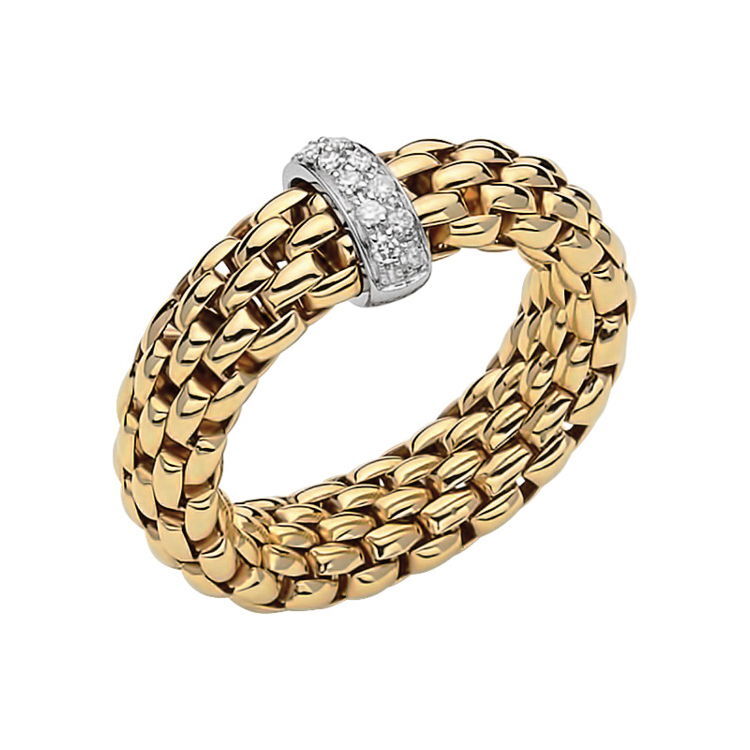 Fope Vendome Flex'It ring crafted in 18k Yellow Gold with pave diamond bar rondel in size US 5.50 - 6.50. Fope is the only company in the world which creates an entirely 18k gold flexible product. A publicly traded company in Italy that doesn't license their technology for flexible gold, so you can be confident when buying that it will be extremely unique with patented technology that will last a lifetime. Available in all three colors of gold and sizes XS (4.25-5.25) through XL (9.5-10.5). Flex'It ring reflect the concept of expandability, just like Fope Bracelets. This means your ring is adaptable, so you can choose to wear it on a different finger and feel comfortable at any time of the day whatever you are doing. When choosing the right ring size, remember that Flex"It rings are a generous fit and if you are not sure which size to choose between two sizes, choose the smaller of the two. Fope Measures their rings in MM but we have converted them into US sizes for your convenience.