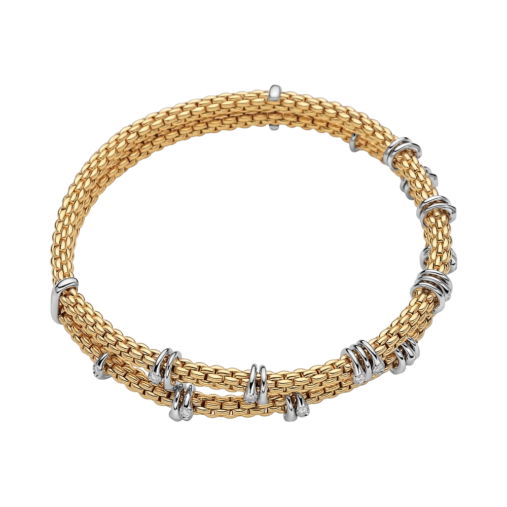 Add a touch of elegance to any outfit with this exquisite Prima Flex'It Double Bracelet. Crafted in 18k Yellow Gold and in size L (18cm), this bracelet features a flexible design of two woven strands, each displaying diamond rondels, with a total carat weight of 0.37cts. The vibrant Yellow Gold of this bracelet pairs perfectly with any ensemble, making it the ideal accessory for any occasion. Show off your style in timeless elegance with this Prima Flex'It Double Bracelet.