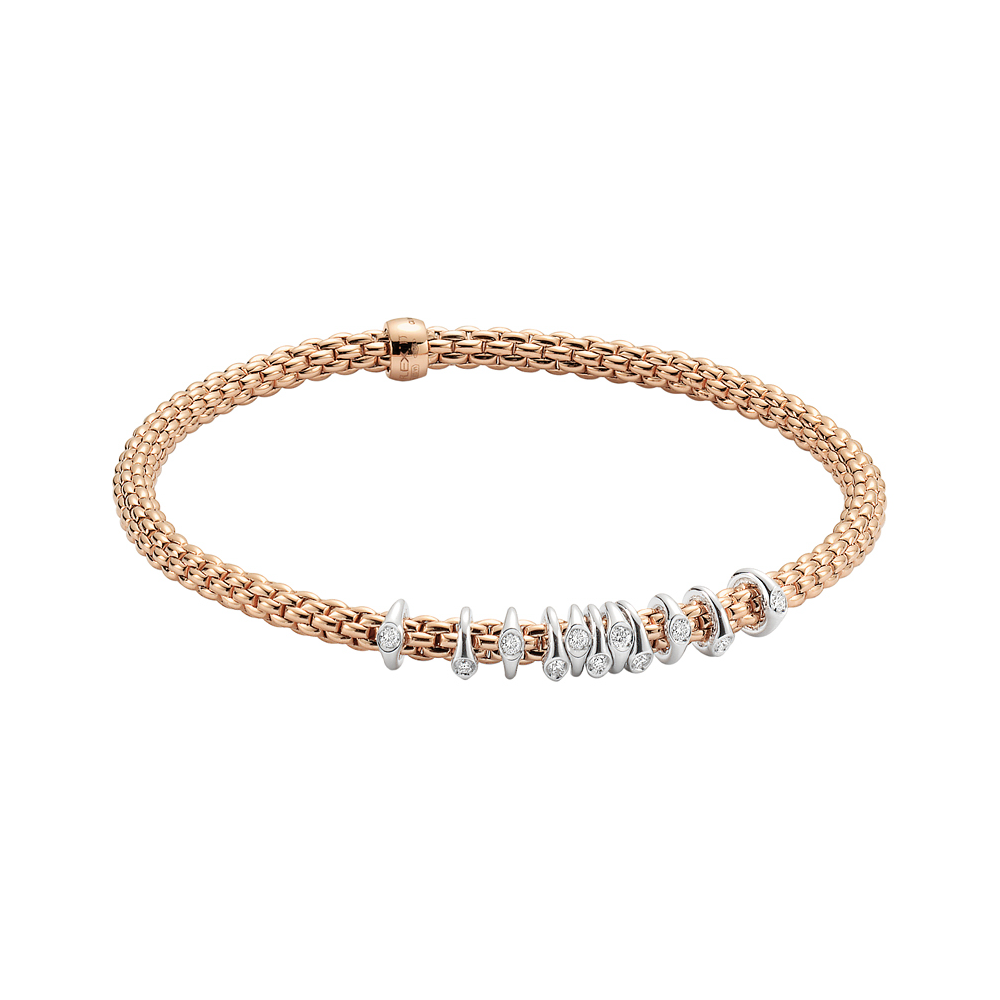 Based on one of Fope’s inventions from the 1950s, this Rose Gold Bracelet with diamonds size Large (18 cm) applies the concept of flexibility to jewelry, blending together luxury and innovation. With its classic gold mesh design reworked in ultra-contemporary style, Flex’it has been proven a global success. Each bracelet has over 100 tiny 18k gold coils set into the interior of the link that allows the bracelet to expand and contract, rolling perfectly onto your wrist with ease. Handcrafted in Italy using 18k gold and diamonds, This bracelet features diamonds that contains 0.15tcw. To find your size, measure the circumference of your wrist using a flexible material such as a piece of thread or a strip of paper, and measure it against a ruler. Choose the corresponding size based in centimeters. To convert inches to centimeters, multiply the measurement of inches by 2.54.